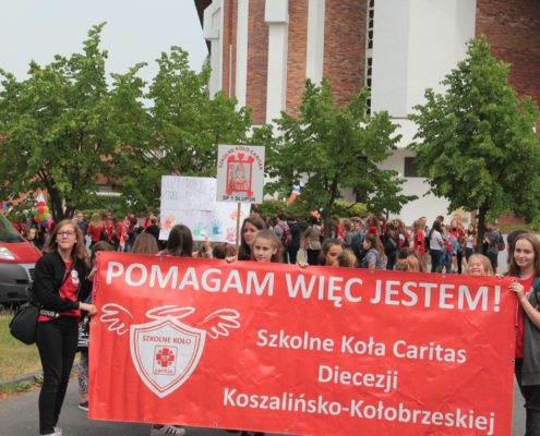15 czerwca w Koszalinie odbyła się doroczna pielgrzymka Szkolnych Kół Caritas. Spotkanie zgromadziło blisko 900 osób - najpierw w kościele pw. Ducha Świętego w Koszalinie, a potem na placu pod amfiteatrem, gdzie wyruszyli z transparentami, flagami i okrzykami, że lubią pomagać.