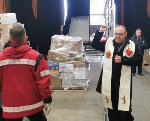 Z hali przy ul. Tramwajowej i z parafii pw. św. Józefa w Żórawinie wyjechały dary, których przekazanie koordynuje Caritas Archidiecezji Wrocławskiej. Transport pobłogosławił bp Jacek Kiciński. Obecny był także konsul Węgier Adam Szesztay, który również przekazał dary dla potrzebujących na Ukrainie.