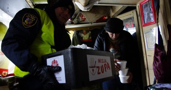 Patrole wrocławskiej Straży Miejskiej rozwioziły dziś gorącą zupę do osób bezdomnych, które nie mogą opuścić swoich miejsc pobytu. Posiłek przygotowany został przez jadłodajnię Caritas we Wrocławiu.