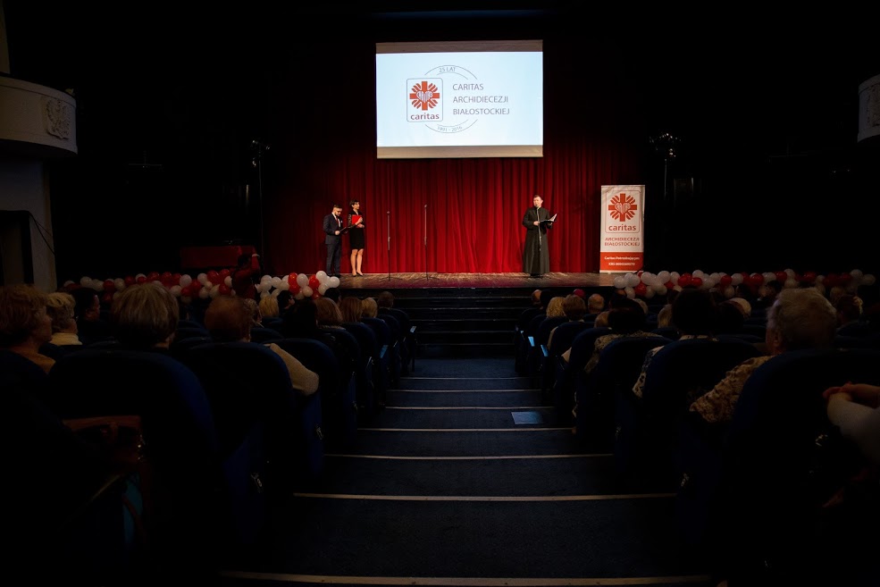 Po Eucharystii wszyscy uczestnicy udali się do Teatru Dramatycznego im. Aleksandra Węgierki, gdzie miała miejsce gala jubileuszowa. Ksiądz Adam Kozikowski przywitał zebranych gości i opowiedział o misji Caritas wypływającej z nauki Ewangelii. „Pięknie się składa, że nasz jubileusz wypada w Roku Miłosierdzia. Papież Franciszek wzywa do nowej, świeżej refleksji: <Miłosierni jak Ojciec>. Doświadczając miłości Boga, powinniśmy nieść ją tam, gdzie jej zabrakło, gdzie się zagubiła, gdzie człowiek nigdy jej nie doświadczył” – powiedział dyrektor Caritas.
