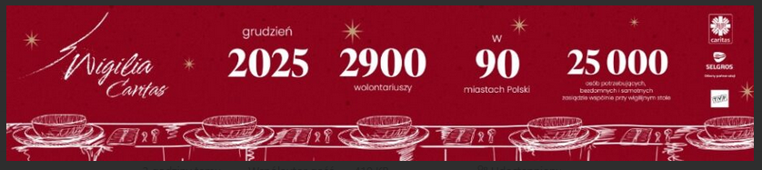 Gdy „Bóg się rodzi, a moc truchleje”, nikt nie powinien być sam. Już po raz dziewiąty Caritas w całej Polsce organizuje wieczerze wigilijne, które są największym tego typu wydarzeniem świątecznym w kraju. W tym roku w 90 miastach do Wigilii Caritas zasiądzie ponad 25 tysięcy osób potrzebujących, bezdomnych i samotnych. Do przygotowania uroczystych kolacji podane zostanie ponad 7,5 tony karpia i 28 tys. litrów czerwonego barszczu.